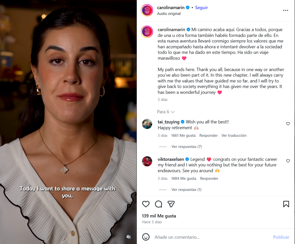 Carolina Marín anuncia su retirada en un mensaje publicado en su cuenta oficial de Instagram.