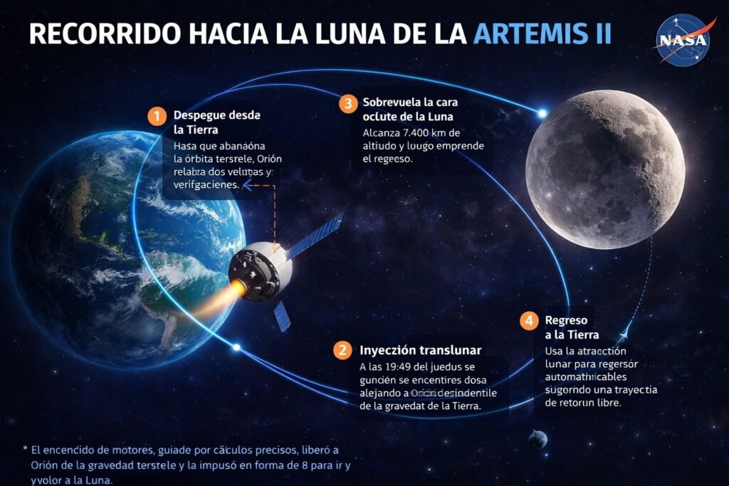 Infografía del recorrido de la misión Artemis II, que muestra la trayectoria de la nave Orion desde la Tierra hasta la Luna y su regreso mediante una órbita de retorno libre.