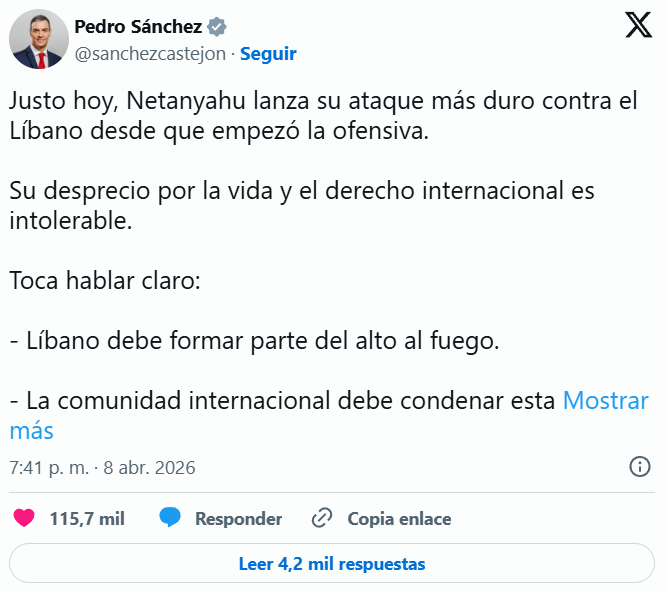 Pedro Sánchez critica la ofensiva de Israel en Líbano y pide incluir al país en el alto el fuego internacional.