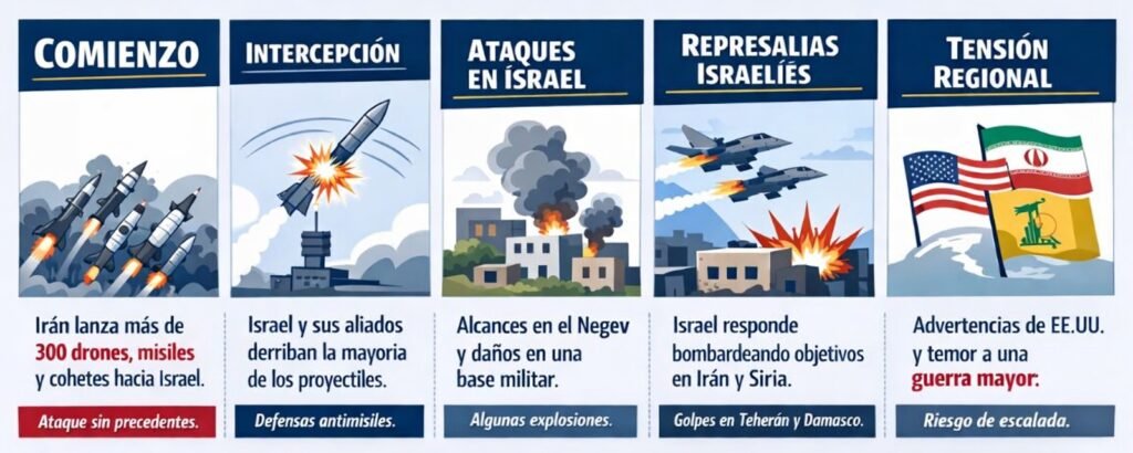 Escalada del conflicto en Oriente Medio: Irán lanza más de 300 drones y misiles contra Israel, que intercepta la mayoría y responde con bombardeos, aumentando la tensión regional y el riesgo de una guerra mayor tras las advertencias de Trump.